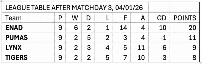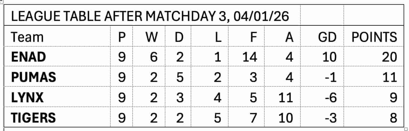 League Table after WFiC League Matchday 3, 04/01/26