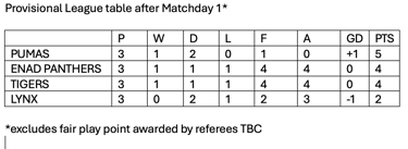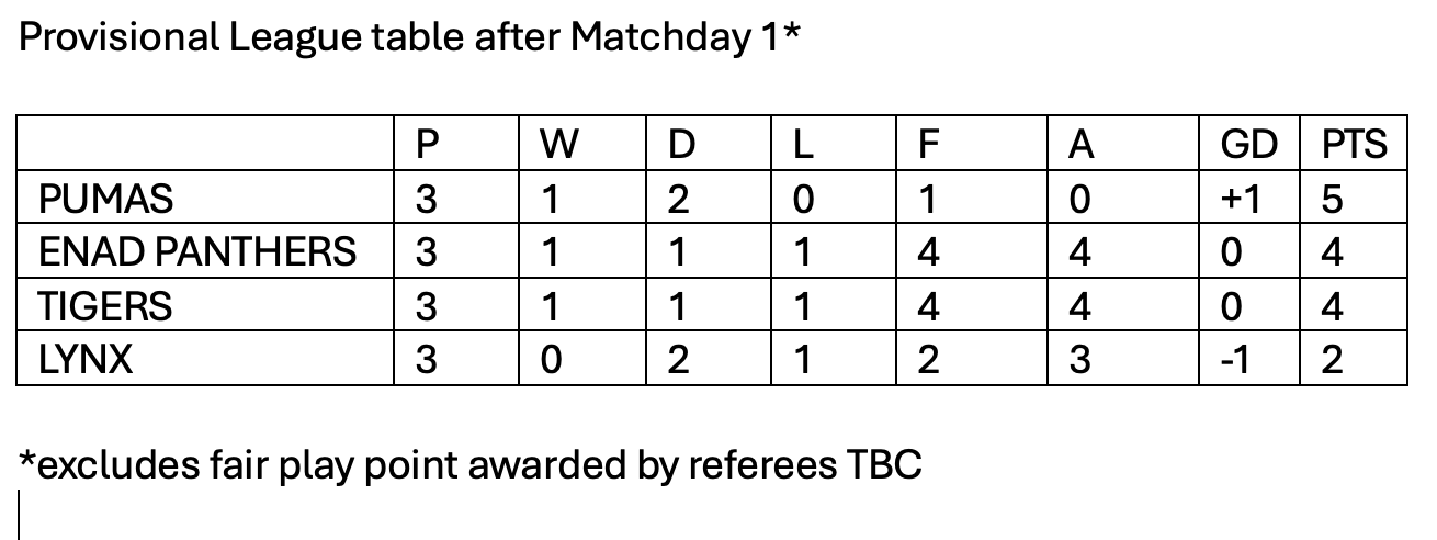 This was an eventual game with a number of fouls in the first half which led to an on-pitch argument; after which a Pumas player was withdrawn to the bench and Andros was dismissed (later rescinded by the referee, who sought independent witness testimony). Despite being a man down for more than half the match, ENAD Panthers worked tirelessly and kept a tight formation, to secure a goalless draw. Player of the match: Dave.
