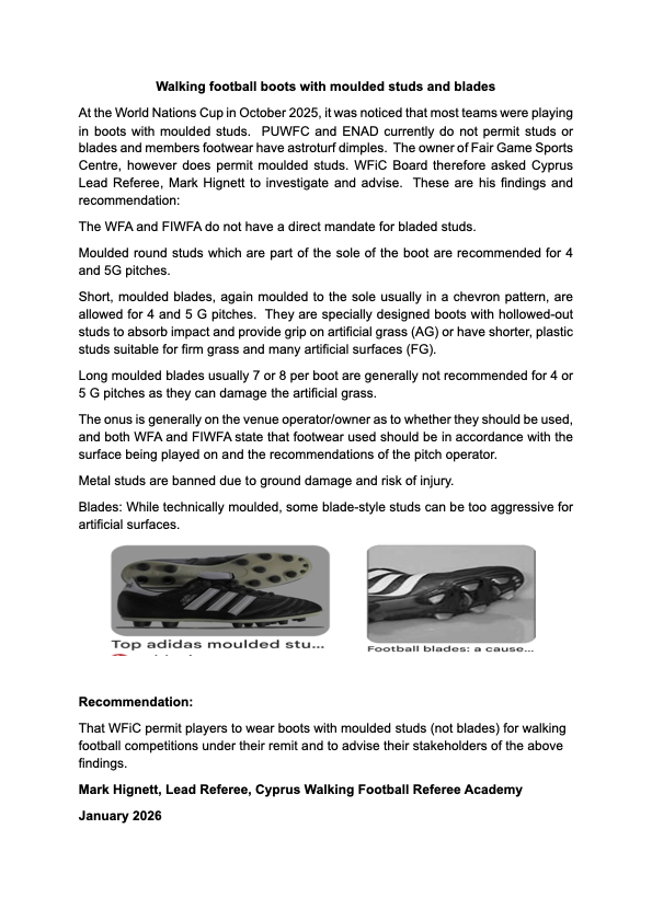 WFiC intend to hold trials starting Sunday 8th February 2026, 17:00 – 19:00 at AM Fair Game Sports Centre, Tremithousa, 8270 and are inviting men aged 50 and over to come along. They must be able to prove they are a Cyprus citizen or a resident for at least 5 years. Please ask interested players to contact exsec@wfic.com.cy by18th January 2026.